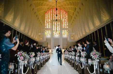 式場見学にお越しいただいた際に温かな光や天井の高さ、広さに感激したと仰っていたおふたり。当日は生演奏や聖歌隊も加わり一瞬一瞬が感動のシーンに。緊張しながらも笑顔をわすれないおふたり。振り向くとそこにはご列席いただいた大好きなゲストの皆様が。皆様の拍手とともに温かさの中で煌めくステンドグラスがおふたりの門出を優しく祝福しているようでした。