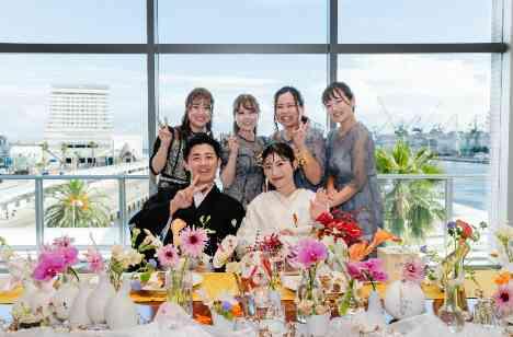 お色直しは和装で登場!洋装の時とは雰囲気も変わり、ゲスト様も沢山お写真を撮られておりました。おふたりのお席の後ろには神戸らしいロケーションが広がっており、その景色におふたりの笑顔も相まってとても和やかで素敵な時間。お花にもこだわっており、おふたりのイメージに合うよう明るく華やかな装花をふんだんに使い、全てがおふたりらしい結婚式となりました。