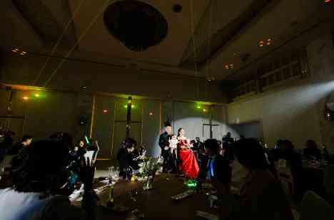 披露宴の再入場では、派手に入場をされたおふたり。 ノートルダムならではのレーザー演出で登場! あまり見ない演出にゲストの皆様もビックリ。 おふたりのお好きな音楽に合わせてレーザーも変わる為、会場のムードも一気に上がりました。 ドレス色当てクイズも行っていた為、同時に会場のボルテージも最高潮。