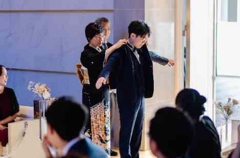 新郎の身支度を整えるジャケットセレモニー。 扉が静かに開き、緊張感のあるなか期待と祝福が重なり合う瞬間。 大切な人の手によってそっと羽織られる一着には、これまでの感謝とこれから歩む人生への静かなエールが込められています。 会場が温かな空気に包まれ、いよいよ始まる挙式への期待が高まる、心に残るひとときになりました。