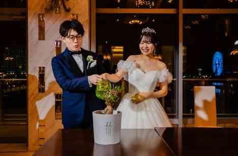 『多幸の樹』『幸せを呼ぶ木』と呼ばれるガジュマルを用いた、ガジュマルセレモニー。 力強く広がる根と幹には『家族の絆』『成長』『幸せが訪れる』という意味が込められています。 ゲストひとりひとりの願いが注がれ、一本の木はその場で新たな命を宿していきます。 時を重ねるほどに力強く成長していくその姿が、おふたりの人生と重なり合う、心に残るセレモニーです。