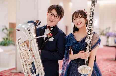 新郎新婦からゲストへ贈られた、心をつなぐ演奏のひととき。 低音同士が寄り添い合う調べは、言葉以上に想いを伝え会場をあたたかな空気で満たしました。 互いの音を感じながら奏でる姿は、おふたりの息の合った関係そのもの。 これまで支えてくれたゲストへの感謝と、これから共に歩む決意が音楽となって届けられた、記憶に残る特別なワンシーンです。