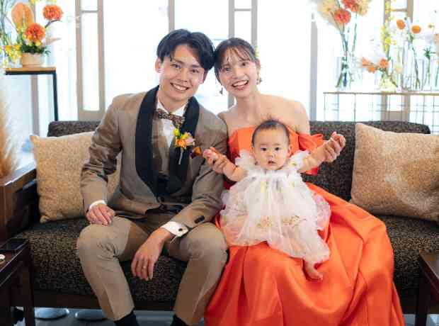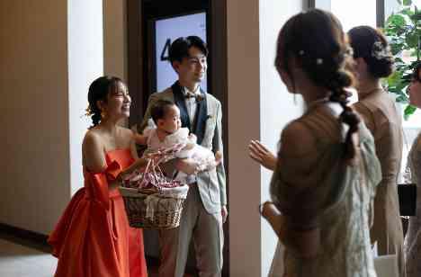 披露宴の結びにはプチギフトを手にしたお見送りのひととき。 新郎様は娘様を優しく抱き上げ、そのぬくもりを胸にひとりひとりのゲストへの感謝の想いを丁寧に伝えていきます。 小さな存在がそっと寄り添うその姿は、ご家族として歩み始めたおふたりの未来を象徴するかのよう。 その場全体が優しい空気に包まれ、心に余韻を残す、あたたかなフィナーレとなりました。