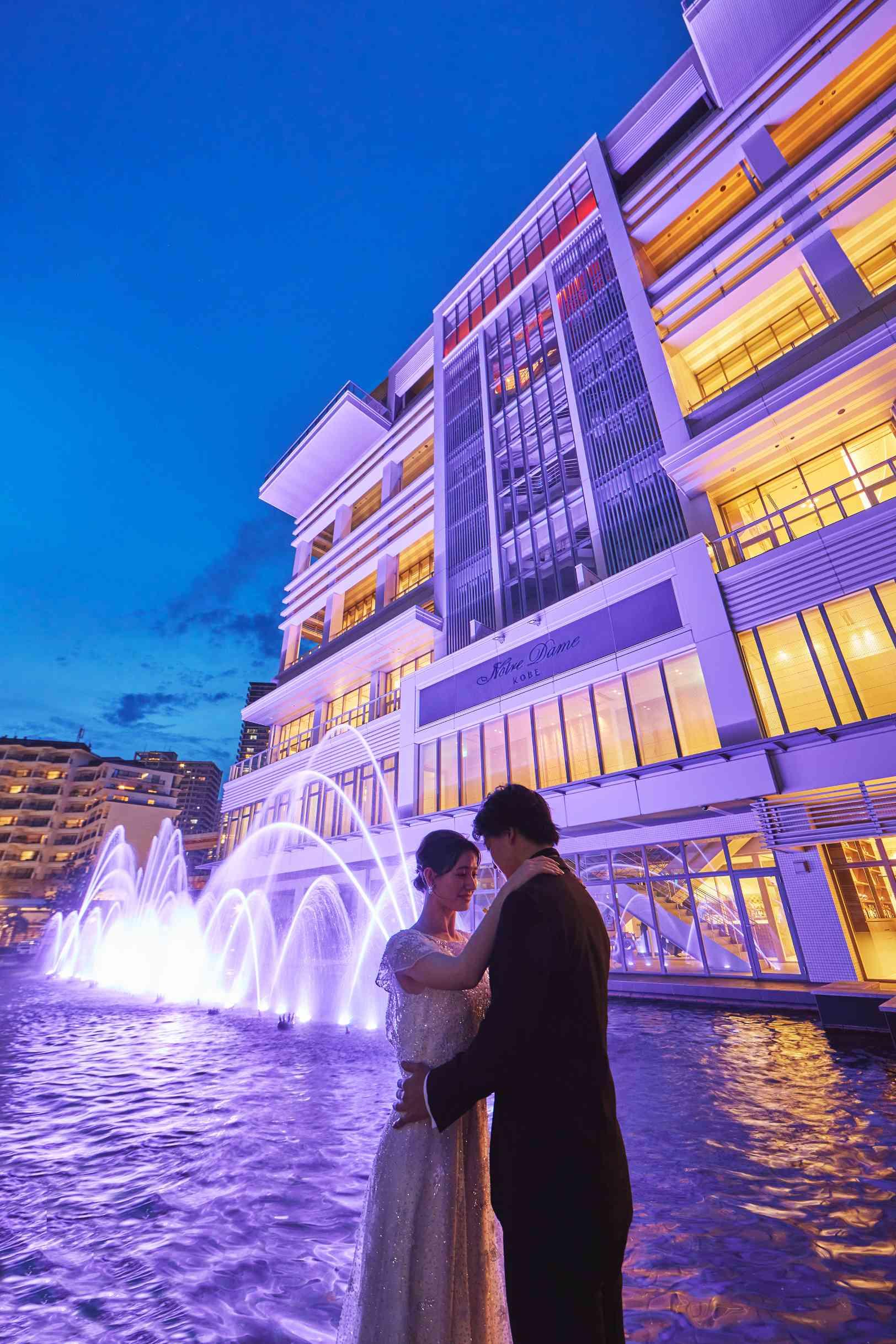 神戸の景色をバックにお写真撮影。明るい時間も夜景の時間もおふたりとゲストの特別な思い出に。 神戸の夜景を一望できるのはノートルダム神戸ならでは。