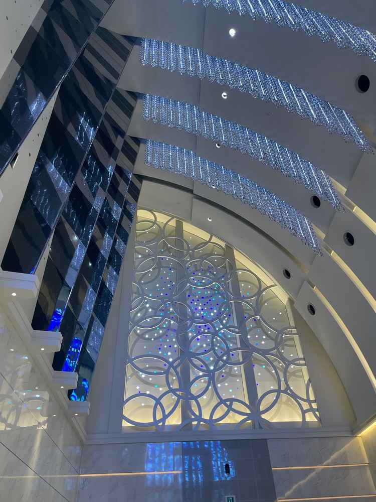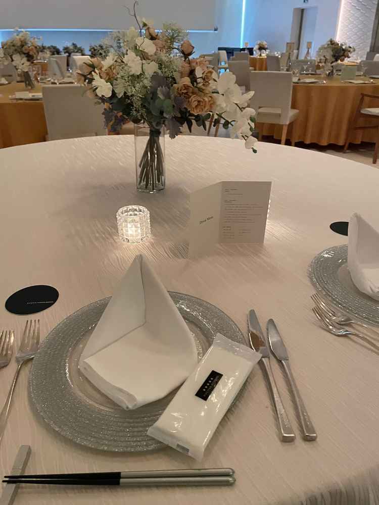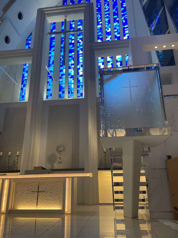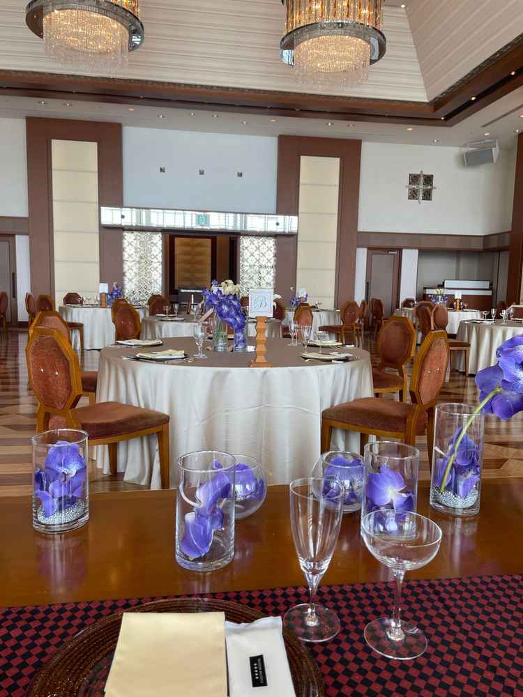 結婚式場はステンドグラスが青く、披露宴会場も床が青く、海にいる様な感覚になりとても幻想的でよかったです。