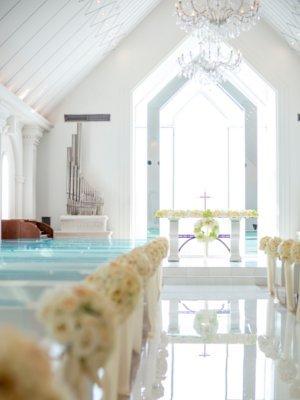 昼は明るい光が拡がり、爽やかなイメージ。夜は、透明感を感じるブルーのライトが幻想的な雰囲気。おしゃれな十字架にもこだわっています。 そこに居るだけで澄みきった気持ちになれる。パールウォーターが放つ幾千もの光がお二人を包み込み、最高の幸せの瞬間を演出します。