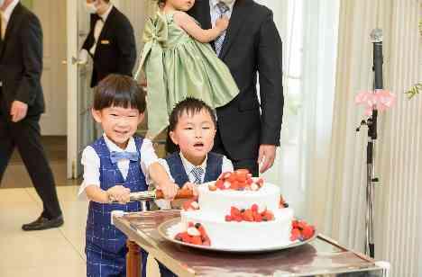 お二人のウェディングケーキが登場!! なんと かわいいゲストさまが運んできてくださいました かわいい演出にゲストのみなさまもほっこり...♡ お手伝いのお礼としておこさまにプレゼントをお渡しされました そして 生クリームが苦手な新郎様へのファーストバイトはとっても小さいサイズのスプーンをセレクトされました(笑)