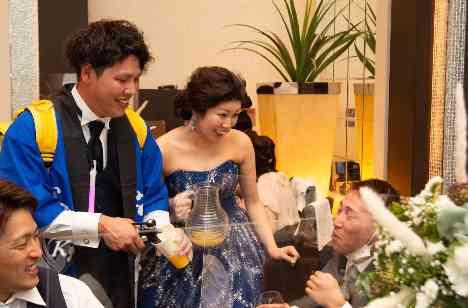パーティーのスタートは 甥っ子さまに乾杯の発声をお願いしました!! おこさまのかわいい乾杯に 会場内ゲストのみなさまの笑顔で溢れました♡ そして!ドレスチェンジされた新婦様と ハッピを羽織り背中にはビールサーバーを担いだ新郎様にご登場いただき お越しいただいたゲストのみなさまへ感謝の気持ちを込めて ドリンクのサービスをしていただきました!!