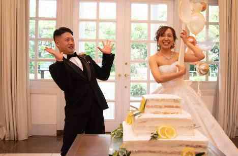 おふたりのオリジナルケーキを入刀した後、ファーストバイトをしました! 新郎様から上手にしていただいた後新婦様が手に持っていただいているのは・・・ 大きなサイズのスプーン🥄✨ スプーンが出てきた瞬間 新郎様、ゲストの皆様もびっくりです! 新婦様も笑顔で思いっきりケーキをすくっていただきました!!