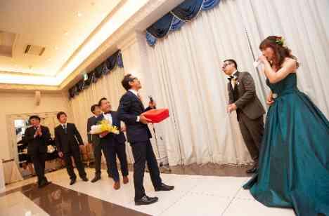 ご入場の際は「わ~♪」と歓声が上がりゲストに楽しんでいただけるようにカラードレス色当てクイズでゲストも大盛り上がり!ケーキ入刀の時にはお2人のステキなショットを撮るためにゲストの方がケーキの周りを囲んで盛り上げてくださいました!お2人と交流のあるご友人様達からサプライズ映像が!映像後にはまさか!いるはずのないご友人様がサプライズで登場!とても驚かれまたまた涙を流し喜ばれていたお二人でした