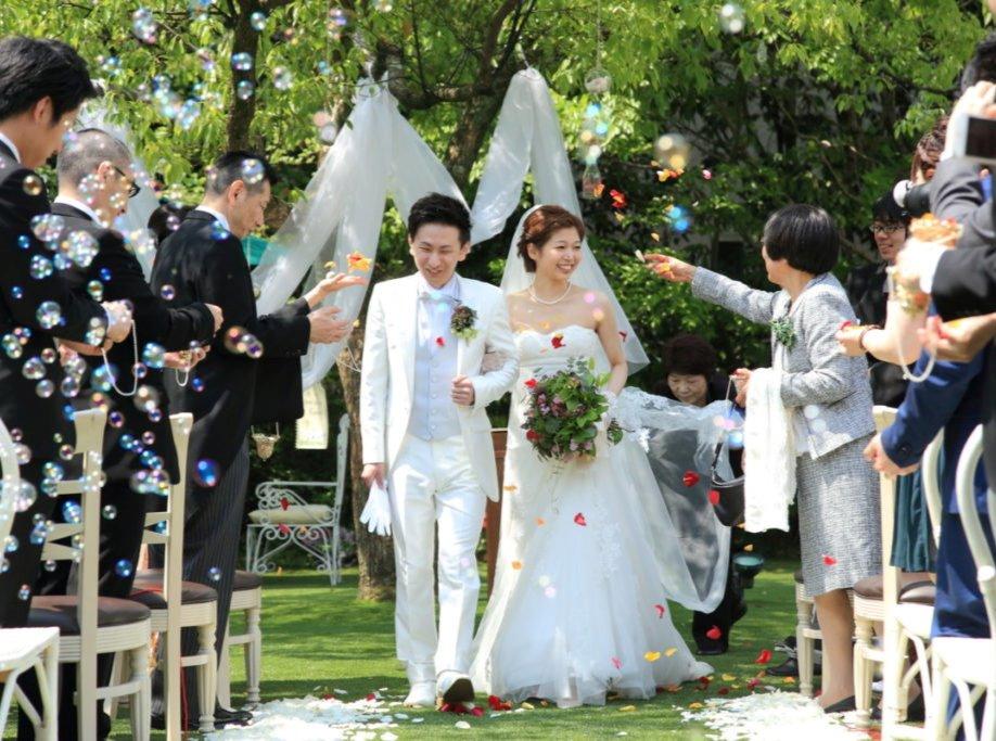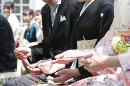 ガーデンでの人前式にはお二人の想いとこだわりが沢山込められていました。 赤い糸でのリングリレーでお二人とゲストの方々を繋ぐ