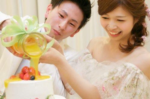 お二人こだわりのドリップケーキの演出で会場は大盛り上がり フルーツいっぱいのケーキの上に、オレンジソースをお二人仲良く注ぎ、ケーキの完成です