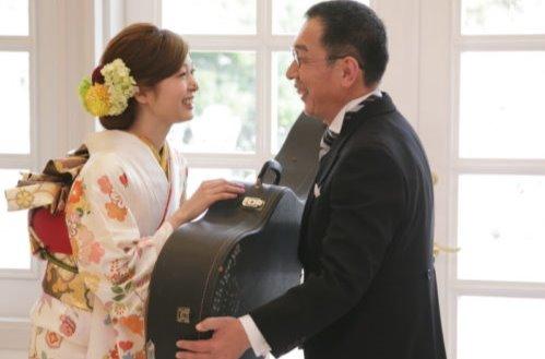 新婦様のお父様からのギターの演奏のプレゼント その前に、新婦様から「お父さん、頑張ってね」とギターの手渡し
