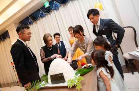 お米が大好きな新婦様♡ ウェディングケーキではなく!特大おにぎりをご用意させていただきました! 今回のファーストバイトはもちろん手作りおむすび! まずはお姉さま方にお手本バイトをしていただきました お手本を参考にお二人にも食べさせ合っていただきました♡ お二人らしさ溢れる素敵な演出でした♪