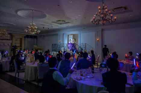 ゲストの皆さまにサイリウムを振っていただき コンサート会場のような雰囲気に♡ 新郎新婦さまのご入場です!! サイリウムの色で新婦様のカラードレスのお色味を予想していただきました 正解した方には 新郎様とのじゃんけん大会への出場権が! 勝利を手にしたゲストさまへお二人からプレゼントを贈っていただきました