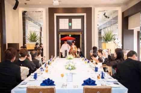 ご披露宴は色打掛にお衣裳チェンジ♡ ご家族の皆さまで一つのテーブルにお掛けいただく 「晩餐会スタイル」をご提案させていただきました 新郎新婦様より「親族紹介」 お名前・肩書きだけでなくエピソードや好きなことのお話をしたり…♡ より皆さまのことを知ることができる楽しい親族紹介でした オープンキッチンからのおもてなしも◎ 和やかなパーティーがスタートです!