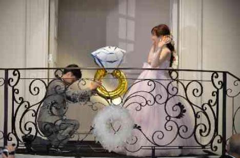 お二人こだわりの演出お色直しの入場からのみなさまサプライズ演出として大きな指輪でプロポーズシーンを再現♪ とっても可愛い入場シーンで注目のシーンの一つとなりました ゲストの方も沢山写真を撮られていました