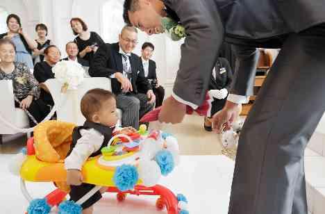 指輪の交換の際にはお二人のお子様に届けて頂きました(*^^*)お二人が手作りで飾り付けをされた歩行器でお二人のもとへ…♡パパとママのところへ一生懸命に歩く姿にゲストの皆様もお二人もとても癒されました♪