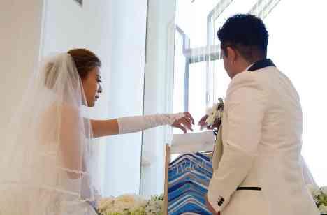 海をテーマにしていたお二人は挙式では サンドセレモニーをされました 受付でゲストの皆様に砂を入れていただき ラストはお二人が完成させます 世界にたったひとつのアートが出来あがりました お二人の宝物です…♡