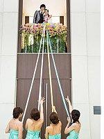 挙式後、新郎新婦様はチャペルガーデンの2階から再登場し、ゲストの皆様からの歓声とたくさんのフラッシュが巻き起こり「スター気分」を味わえます。また、女性のご友人様へのブーケプルズをカラフルなリボンを使うことでより一層、華やかなイベントになります。