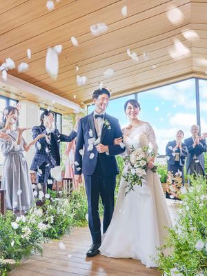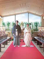 チャペルの扉が開くと正面には大きなガラス窓。柔らかな自然光をふんだんに取り入れられる明るいチャペルでゲストに見守られながらおふたりの愛を誓います。