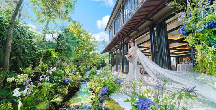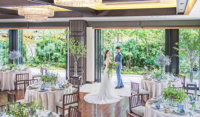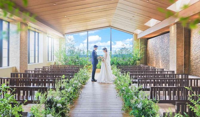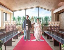 自然光をふんだんに取り入れられる明るいチャペル。壁には清き水が伝い、美しい水の音がおふたりを包みます。全天候型のチャペルで雨天時も安心。和装も洋装も似合う会場だからこそ叶う和装人前式や館内での神前式から本格神社・仏閣での挙式もフルサポートいたします