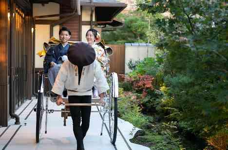 新郎様のご希望であった京都らしさを演出するため、再入場は和装をお召いただき、結婚式専用の寿の人力車に乗ってテラス入場をしていただきました。これにはゲストもびっくり!ゲストの掛け声で鯛の塩釜開きをしていただいた後は、鯛を使ったお茶漬けビュッフェも。京都らしさをゲストの皆様にご堪能いただくことができました。