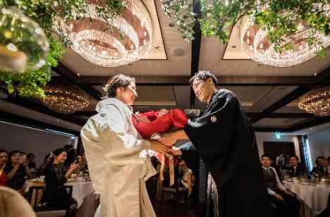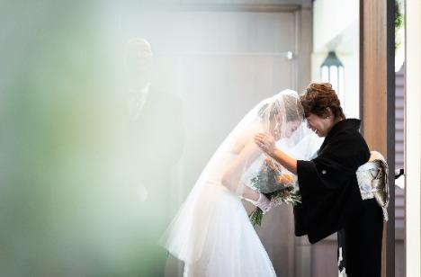 今まで育ててくれた感謝と「素敵な人に出会えたので、安心してね」という言葉を親御さまに伝え、会場内に入場されたご新婦さま。 その言葉を聞いた親御さまの瞳には涙が浮かび、とても感動的なシーンとなりました。 また、誓いの言葉はご友人たちによる【誓い合わせの儀】。今まで支えてくれたお互いのご友人さまより、大切にしていただきたいことを伝えていただきました。