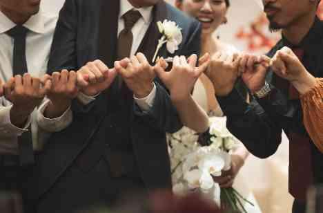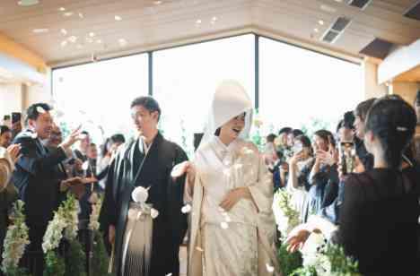 せっかくの日本での結婚式なので、衣裳はドレスではなく和装に。和ならではの雰囲気も大切にしつつ、よりアットホームな雰囲気の中で挙式をすることが出来る和装人前式を行いました。 入場時は、おふたりの和装姿にゲストから歓声があがりました。 英語と日本語を交えた誓いの言葉、ゲストとつくる結婚証明書やリングをご友人に届けていただくなど、人前式ならではの演出も取り入れて、あたたかな空気感の挙式となりました。