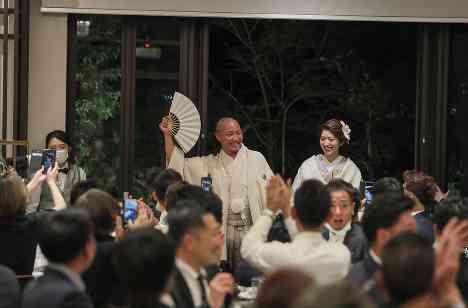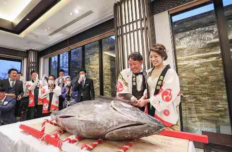 新郎様のご友人様がおふたりの為に考えたサプライズのご余興は・・・なんと、マグロの解体ショーでした! ゲストの方々はもちろんですが、当日まで全く内容を聞かされていなかったおふたりは大きなマグロの登場にビックリ! 実際におふたりもマグロへ入刀されたり、解体ショーを生で見られ、会場内も大盛り上がりでした。