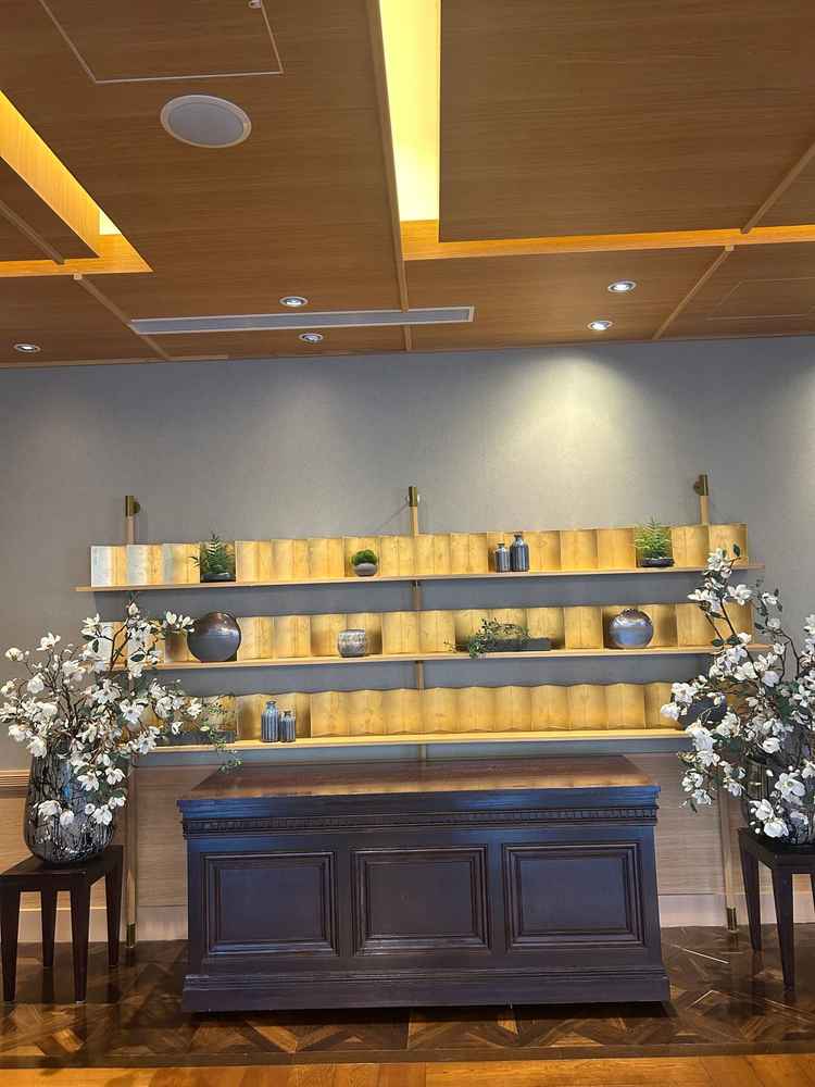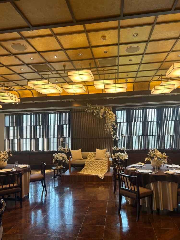 1階の会場の雰囲気を気に入りました。高砂の後ろには、滝が流れており、五重塔も見えるところが魅力的でした。