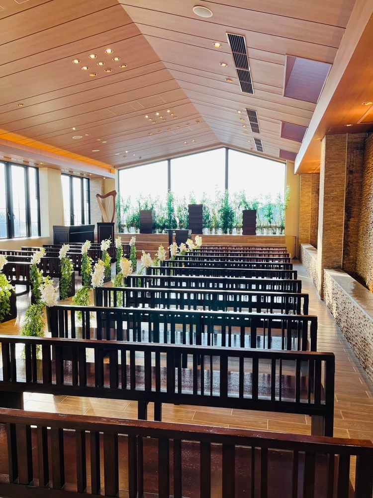 お庭があり、和装が映えそうな披露宴会場でした。チャペルは木目調であたたかみがあると感じました。エレベーターからチャペルのあいだに外気を感じられる空間があるのも素敵でした。