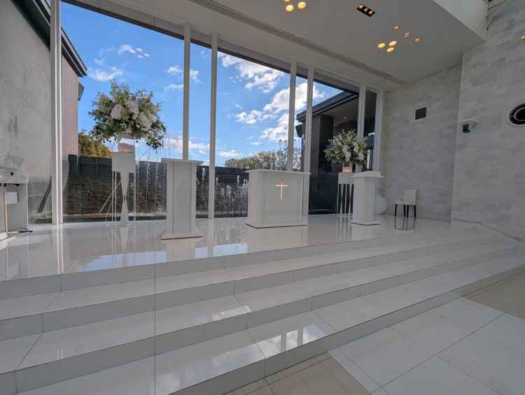 挙式会場から綺麗に青空が見えて、非常に綺麗でした。ただ、個人的に披露宴会場の照明等が少し古臭さを感じました。