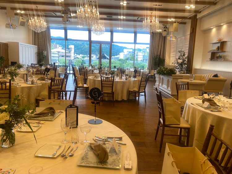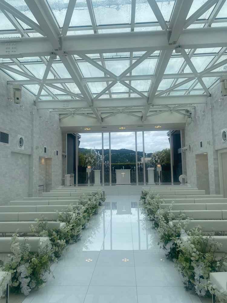 会場に入るとパッと光が入り真っ白なチャペルがより綺麗に見えてその奥には京都の景色が見える非常に綺麗な雰囲気