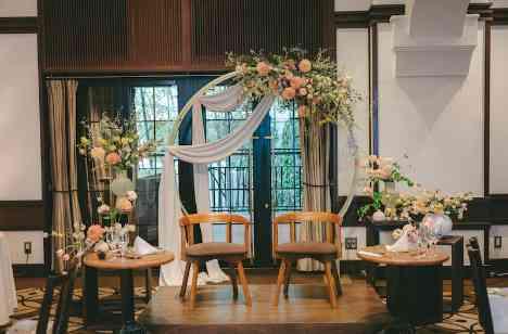 コーラルやオレンジといった柔らかなカラーのお花で春を感じられる空間に。 「THE ORIENTAL ROOM」の木目調で落ち着いた雰囲気と開放的な窓から見える竹林の鮮やかな緑に春らしい色味のコーディネートがより映えます。 距離感の近い披露宴会場だからこそ、カジュアルでアットホームな空間にするためおふたりのメインテーブルはチェアスタイルに。