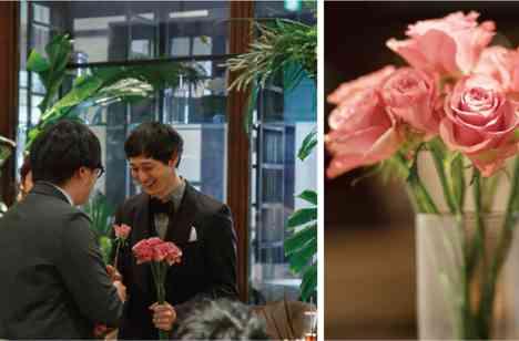 ひとりひとりに大切な思い出がある そんなふうに話されていたおふたりの再入場はダーズンローズセレモニーで。 ダーズンローズセレモニーの12本のお花には、「愛情・情熱・感謝・希望・幸福・永遠・尊敬・努力・栄光・誠実・信頼・真実」という意味が込められています。おひとりおひとりへの想いを込めて、メッセージをお届けし、じんわりと心があたたまる時間に。