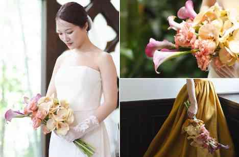 “かっこよくおしゃれに”そんなおふたりのご希望を叶えるために、夏らしく明るいオレンジやテラコッタのダリアやカラー、エキナセアをベースにボルドーやブラックの花瓶を使用して全体的に引き締まった印象に仕上げました。 ウェディングブーケは、カラードレスの色味にも合うよう締め色になる濃い紫のカラーと淡いアプリコットのトルコキキョウやミディファレをあわせてかっこよくスタイリッシュな雰囲気に。