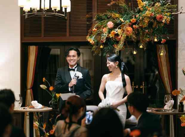 おふたりらしさが詰まった素敵なオープニングムービーが上映されおふたりがご入場。オープンキッチンの扉が開きおもてなしのお料理が運ばれます。温かく美味しいお料理とともに和やかな歓談時間を過ごされました。その後の歓談時間もおふたりの周りには常にゲストが集まり会話やお写真撮影を楽しんでいらっしゃいました。おふたりの人柄が感じられ、またおふたりがどれだけ愛されてきたのかを感じられる時間となりました。