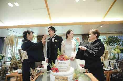 お二人はご用意されたケーキに入刀をした後、 お母様に【ラストバイト】をして頂きました。 ラストバイトは今まで育ててくれたお母様から食べさせてもらうとても感慨深いセレモニーです。 お二人とも育ててくれたお母様から食べさせてもらうケーキを食べてとても素敵な笑顔でした。 そのあとはお二人でファーストバイトを行い、 ゲストの皆様も写真撮影を楽しまれました。