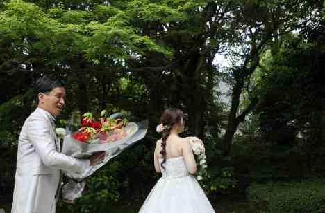 結婚式は、無事おひらきになり、新郎新婦様はそのまま写真撮影へ! 洋と和、2つの雰囲気の庭園をしっかりと残すため、撮影をしていました。 そんな中、何やら新郎様が怪しい動き(笑) なんと、新婦様にサプライズで花束をご用意! まさかのタイミングとまさかのサプライズに新婦様の笑顔も120%! それをみた新郎様も笑顔120%でした(^^