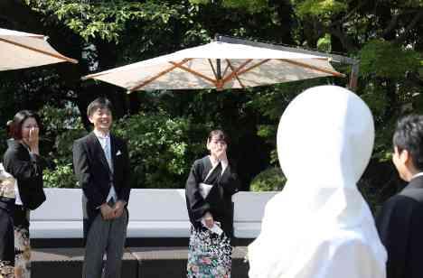 新緑がきれいな6月。 天気にも恵まれたおふたりの結婚式は、ご家族・ご親族だけのアットホームウエディング。 きれいな和装に身を包んだおふたりは、写真撮影をまず楽しんでいらっしゃいました。 新緑と太陽の光がとてもきれいに差し込みました。 そんな中、ご両家親御様を洋風のガーデンまでお呼びして、【ファミリーミート】を行いました。