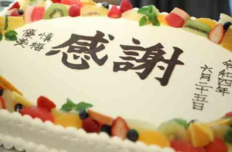 披露宴が始まり、新郎新婦様の雰囲気も和装→洋装へガラッとチェンジ!大きなイベントをたくさんするというよりかは、ゲストと一緒に写真を撮ったり、お話したり、お食事を楽しんだり…。 とそこでおいしそうなウエディングケーキが登場! そこには大きく【感謝】の文字が…。 新郎新婦から今までお世話になったみなさんへの気持ちを表現しました。