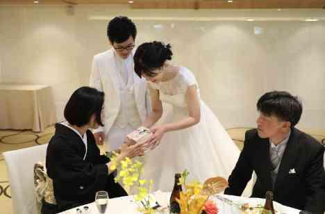 披露宴の後半、なにやら新郎新婦様がごそごそを準備をしはじめました。 ひとりひとりに用意した名前入りの贈り物を自分たちの手で配りました。 普段であれば、席においておくものをあえて、手渡しにすることでより一層、感謝の気持ちをお伝えされました。 貸切だからこそ、ゆっくり時間を使いながら大切な1日を過ごしたおふたりでした。
