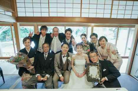 おふたりのご会食会は、FURIANの和室で行われました。 少人数様には、ちょうどいい距離感だからこそ、おいしいお料理の囲みながら、みなさんで何気ない会話を楽しんで頂くことができます。 おふたりのご結婚式も家族婚ながら、シーンとすることなく、終始、話し声と笑い声が絶えませんでした。 ふたつの家族がひとつになり、最後はみなさんで集合して、とっても素敵な1枚が撮れました♪