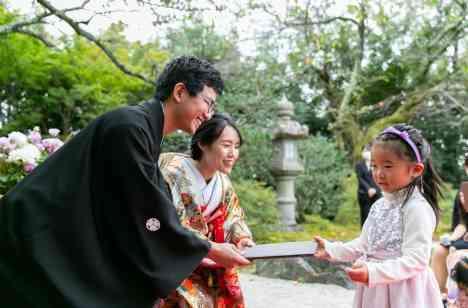 おふたりが挙式スタイルで選ばれたのは和装を着て行う人前式を選ばれました。 自由度の高さを活かし、おふたりのご結婚式のテーマでもある絆を意識し、参加されたゲストの皆さまにも挙式の進行を手伝って頂きます。 まずおふたりの大切な指輪を届けるのは甥っ子。 そしておふたりのご結婚を証明する結婚証明書は姪っ子に届けてもらいました。 ゲストの方皆様との絆を感じる温かなとてもいい挙式となりました。