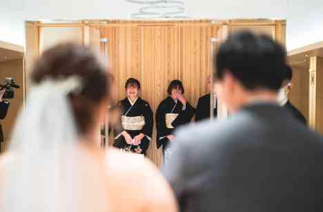 おふたりの素敵な1日は【ファミリーミート】から始まりました。 【ファミリーミート】とは、ファーストミートのご家族バージョン。 小さいころから一番近くで見守って、たくさんの愛情を注いでくれたご両親へ一番初めに晴れ姿を見せたいということでこの場を設けました。 そんな成長したおふたりをみて、涙するお母様たち。