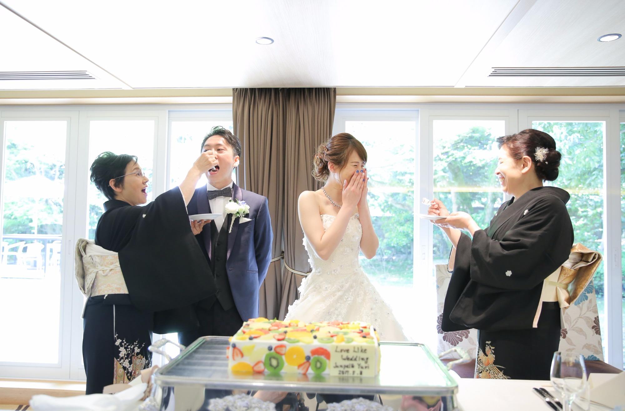 両家お母様にご協力をいただき、ファーストバイトの前に 食べおさめバイトを!サプライズだった事もあり、お母様方の驚いた顔や、昔を思い出しながらの「あーん」の瞬間は新郎新婦様共に嬉恥ずかしの表情♪