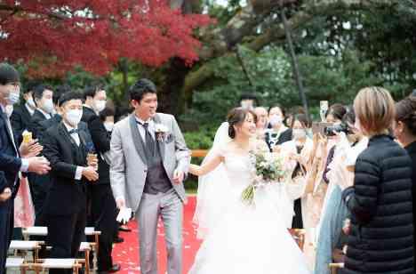 そのままおふたりは、日本庭園へ。次は、今まで大切に育ててきてもらったお母様へ【ファミリーミート】のサプライズを行いました。 お互いの姿を見ると新婦様・お母様の目には涙が…。 今まで沢山の想い出を共有してきた分、感謝の気持ちが溢れだしました。 そのあとは、紅葉が綺麗な日本庭園で人前式! 姪っ子・甥っ子、そしてゲストの皆さんにお手伝いして頂きながら、滞りなく挙式を迎えました。