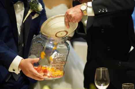 そのあとは、ケーキ入刀ならぬ【ケーキドリップ】 おいしそうなケーキにさらにおいしそうなラズベリーソースをかけて、ケーキイベントを行ったおふたり。 せっかくなのでゲスト参加型!フルーツポンチ作り! とってもおいしそう(^^★ そのあとは、新郎ご友人様によるクイズ大会!あれ?新郎新婦様も参加?(笑) 終始、大盛り上がりですすんだ披露宴でした(^^♪
