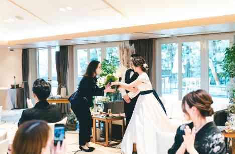 それは、披露宴の途中で行われたプレゼントプルズの時です。 ゲストの方をお呼びし、プレゼントプルズを行ったおふたり。 進行はここまでなんですが、どうしても感謝を伝えたい人がもうひとり。 そう!いままで一緒にこの日を作り上げてきた担当のウエディングプランナー! 最大限の感謝を込めて、ブーケをプレゼント! おふたりのやさしさに涙ぐむ担当プランナーでした♡